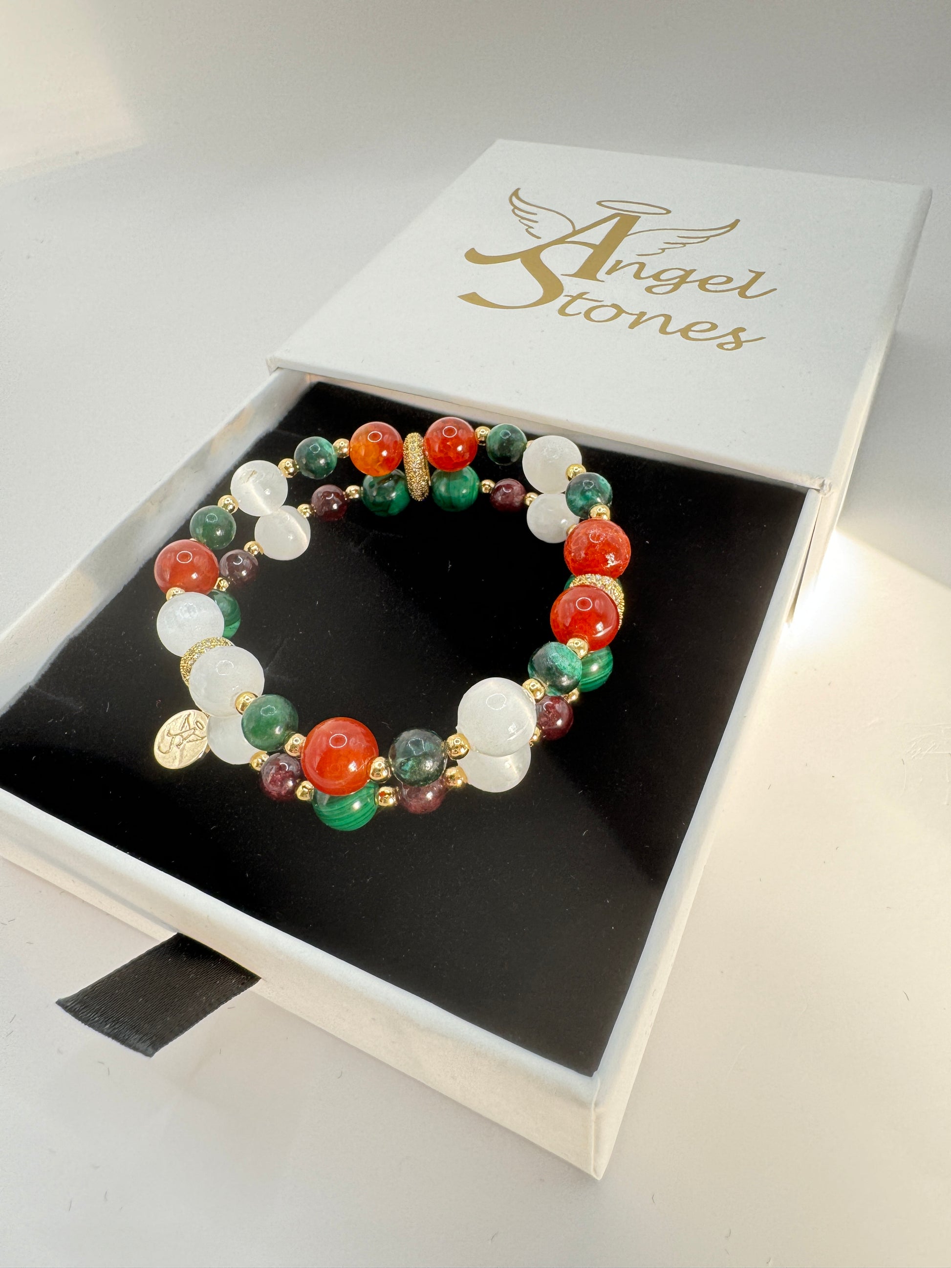 Bring the magic of the season to your wrist with this handcrafted gemstone bracelet — a radiant mix of deep green malachite, glowing carnelian, and ethereal white selenite, accented with golden touches that shimmer like candlelight on snow.
